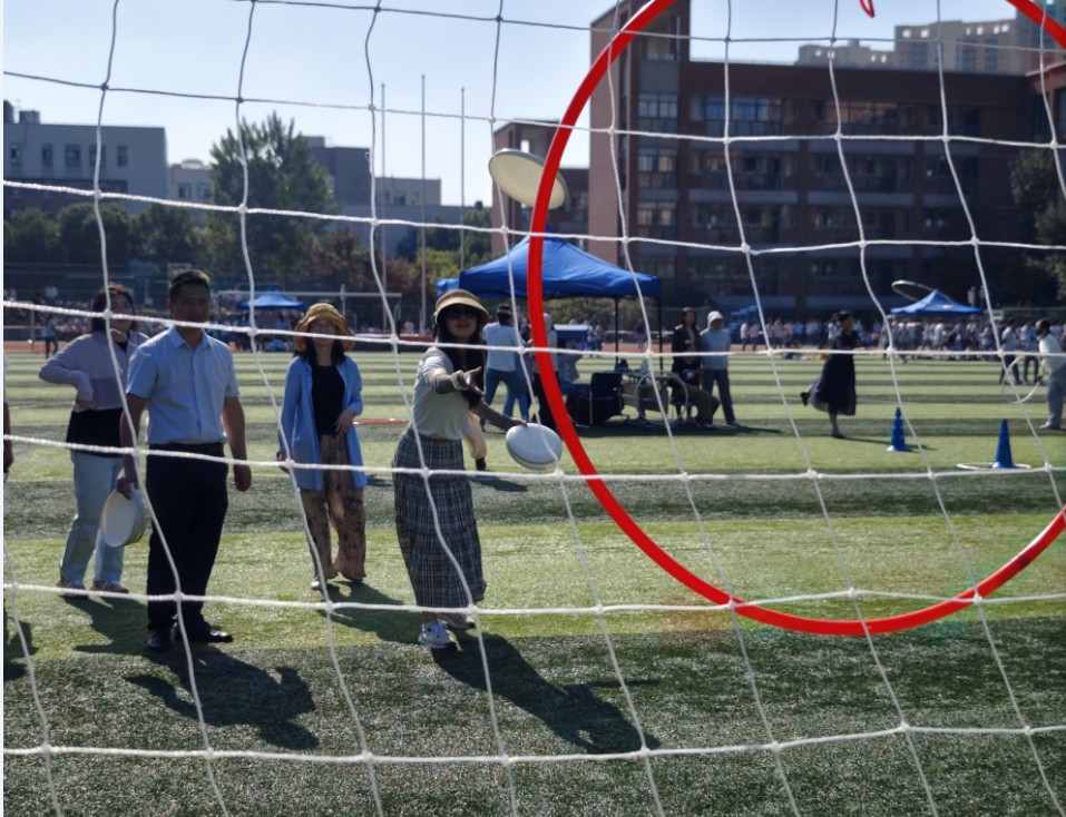 飞盘比赛作为新兴项目,吸引了众多老师参与。投掷区内,老师们认真瞄准,控制力道与角度,力求飞盘能稳稳覆盖住前方的目标。现场既有“一击命中”三分目标的精准,也有毫厘之差的惋惜,轻松愉快的氛围贯穿始终。