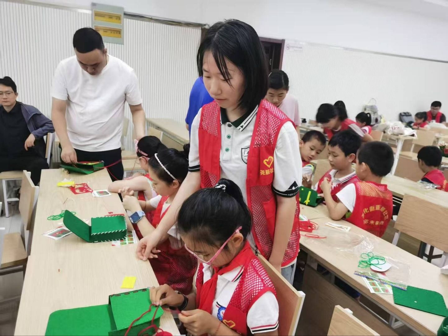 在社区儿童课堂里,学生志愿者们发挥特长,通过趣味绘本讲解、手工制作教学等形式,陪伴留守儿童与双职工子女度过欢乐时光;